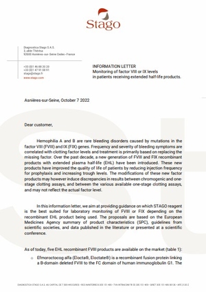 In the information letter below, we aim at providing guidance on which STAGO reagent is the best suited for laboratory monitoring of FVIII or FIX depending on the recombinant EHL product being used. The proposals are based on the European Medicines Agency summary of product characteristics (SPC), guidelines from scientific societies, and data published in the literature or presented at a scientific conference.